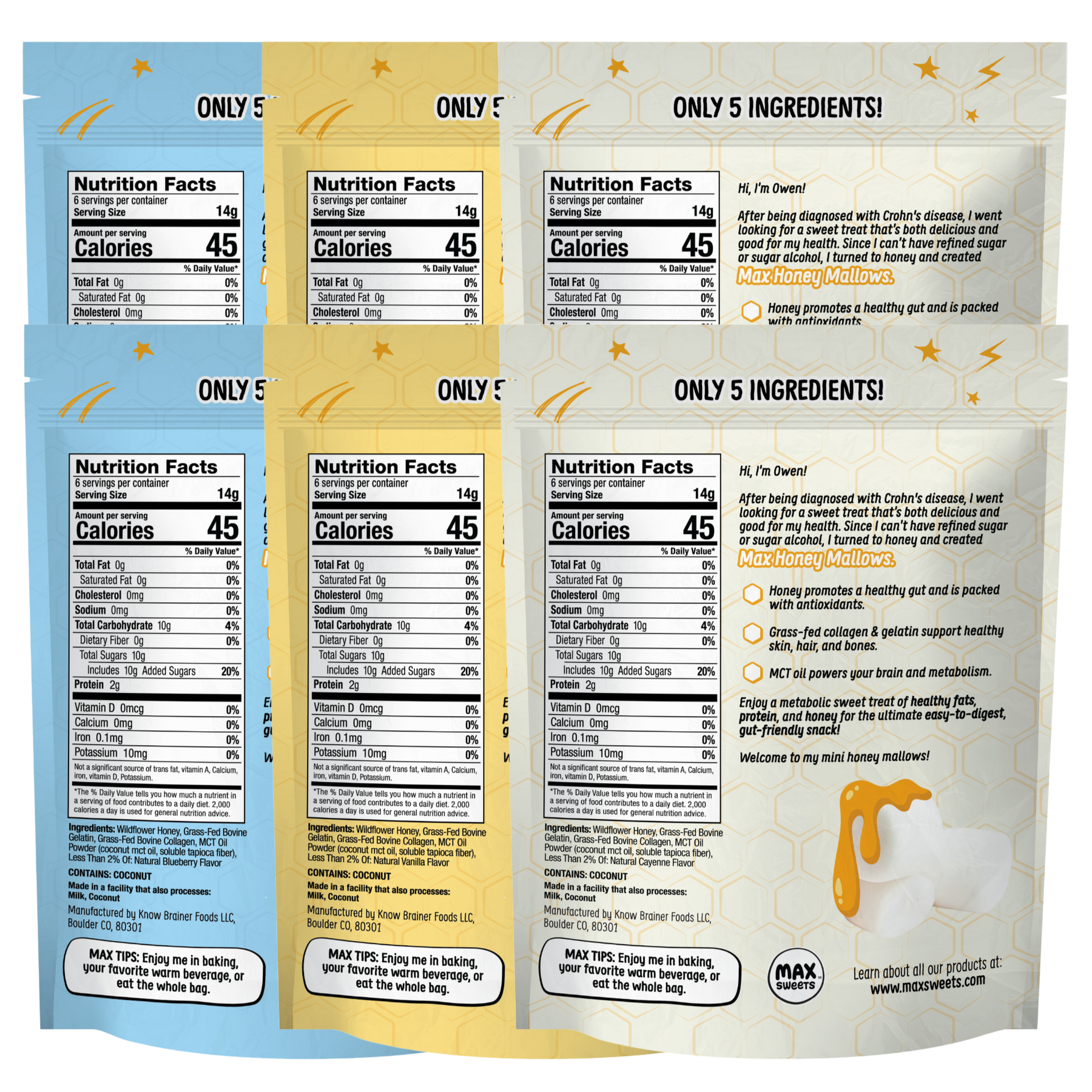 We spent over a year working through hundreds of formulations to create azero-sugar formulation we could use in our favorite sweet treats likemarshmallows,caramels, andtaffy. We also figured out a way to include all of the maximum benefits you want—like protein, healthy fats, and fiber—without any bad stuff you don’t.