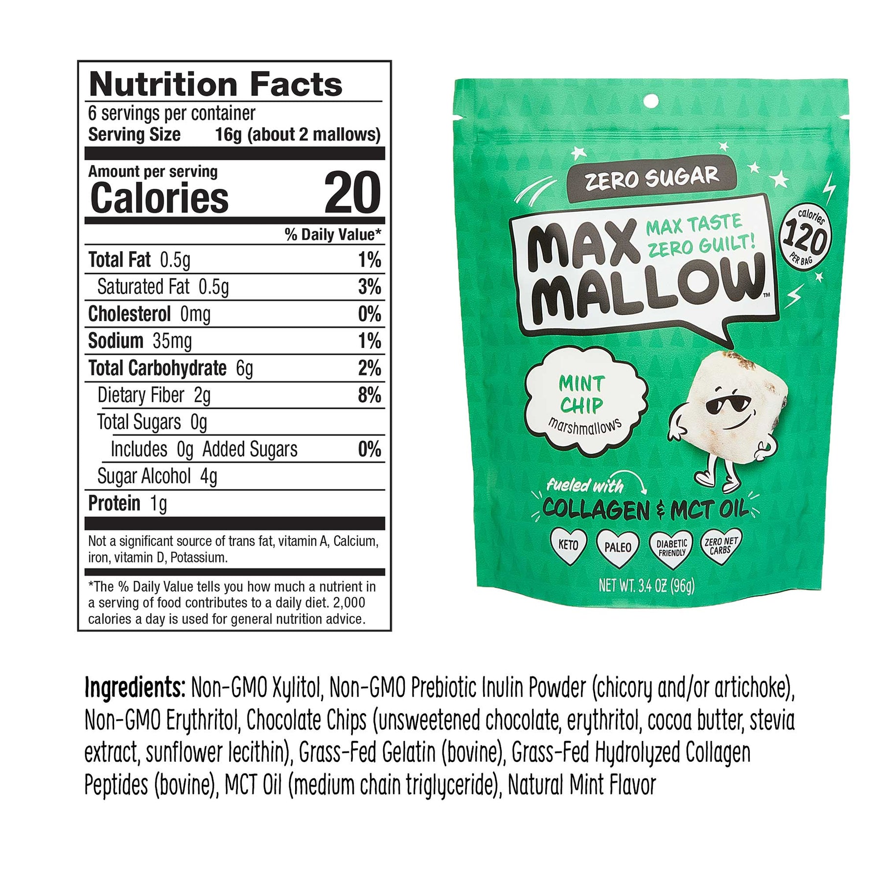Max Sweets Sugar-Free Mint Chip Mallows with nutrition label